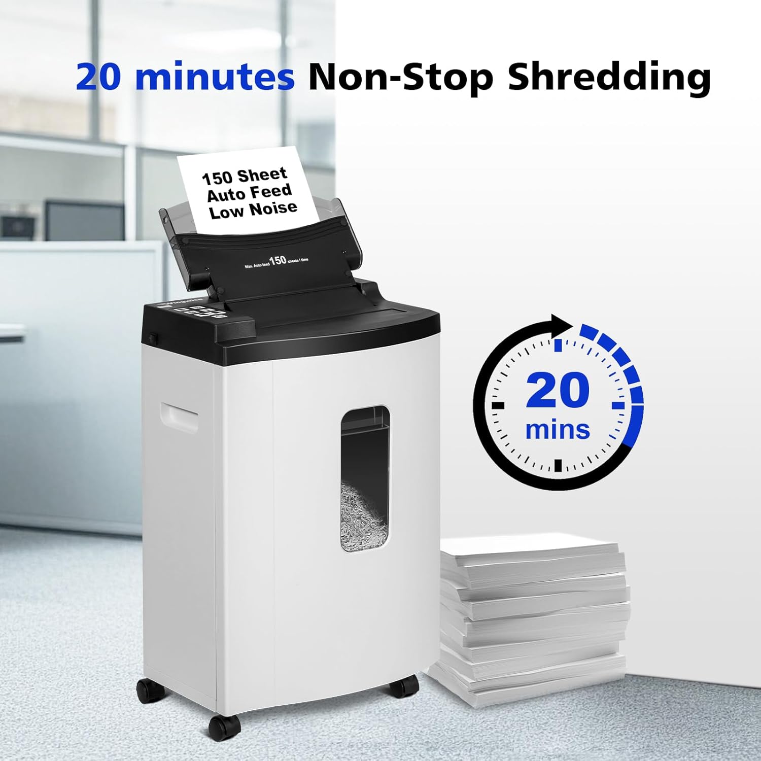 - ��Auto-Feed 150 Sheets��Effortlessly shred up to 150 sheets automatically with hands-free operation��perfect for bulk document disposal. Simply load the stack and let the machine do the work, saving time and effort.