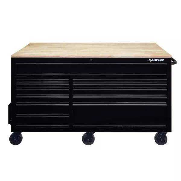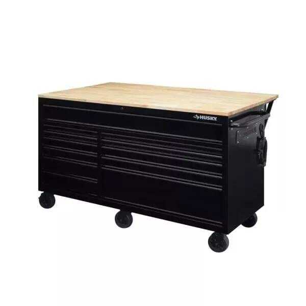 The Husky 62 in. 12-Drawer Mobile Workbench with additional full length fold up wood top is a tool cabinet that combines the perfect blend of drawer storage capacity and functional work surface area for the tool enthusiast. This rolling tool cabinet has heavier 21-Gauge steel. This workbench is 24 in. D plus additional 12 in. that fold up providing more usable work space that is strong enough to support 1,600 lbs. and has 27,840 cu. in. capacity. The 1 in. thick solid wood top is sealed with a protective coating to protect it from the elements. The workstation is equipped with a power center with 6 outlets and 2 USB ports. Premium drawer liners are included to help keep tools from moving around. Each drawer is equipped with 100 lbs. rated soft closing ball bearing slides. The deep bottom drawer has double 100 lbs. rated soft closing slides to enable you to store your heavier bulk items. This mobile work center has 6 large, 5 in. x 2 in. all swivel casters and a steel tubular side handle, which allow you to easily move around, even when fully loaded. The Mobile Work Center also has an internal keyed locking system, with 2 keys provided, for added security. This unit has all blacked out features making the entire unit black for an appealing look.