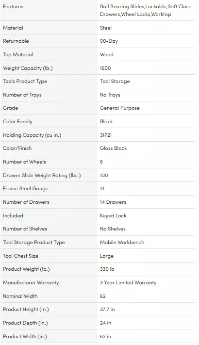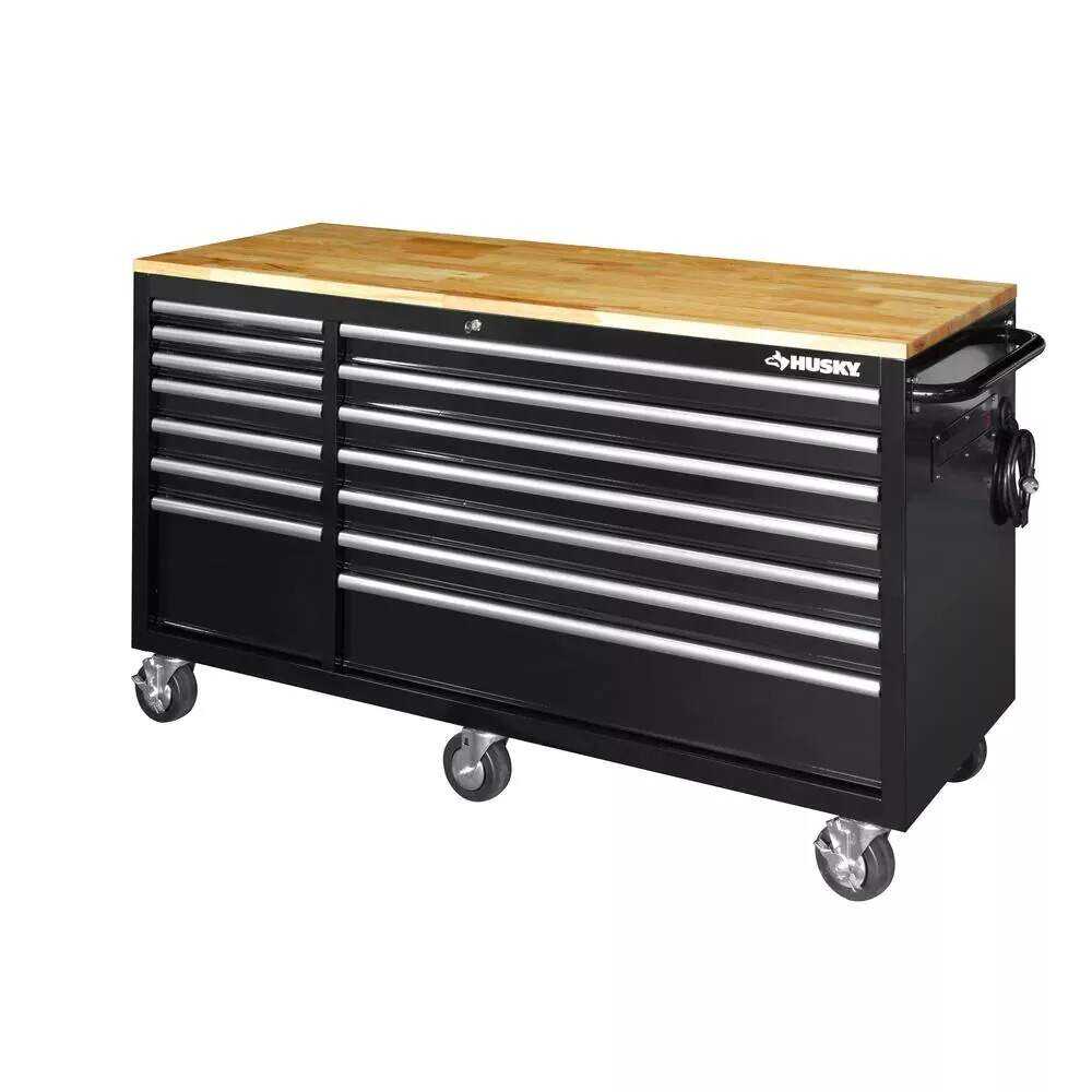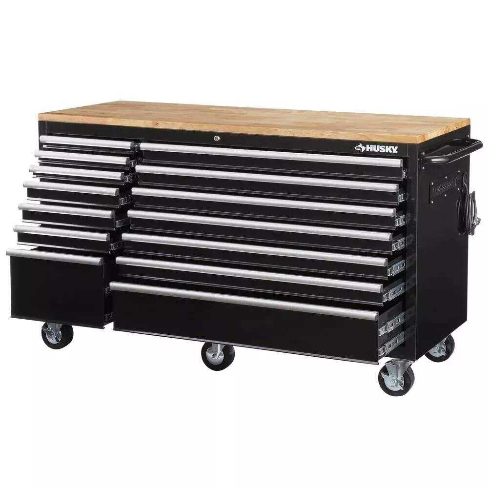 The Husky 62 in. 14-Drawer Mobile Workbench is a tool cabinet that combines the perfect blend of drawer storage capacity and functional work surface area for the tool enthusiast. This rolling tool cabinet has heavier 21-Gauge steel. This workbench is 24 in. deep, which is 6 in. deeper than most standard rolling tool cabinets, providing more usable storage space that is strong enough to support 1,600 lbs. and has 31,721 cu. in. capacity. The 1 in. thick solid wood top is sealed with a protective polyurethane coating to protect it from the elements. The workstation is equipped with a power center with 6 outlets and 2 USB ports. Premium drawer liners are included to help keep tools from moving around. Each drawer is equipped with 100 lbs. rated soft closing ball bearing slides. The 2 deeper bottom drawers have double 100 lb. rated slides to enable you to store your heavier bulk items. This mobile work center has 6 large, 5 in. x 2 in. all swivel casters and a steel tubular side handle, which allow you to easily move around, even when fully loaded. The Mobile Work Center also has an internal keyed locking system, with 2 keys provided, for added security.
