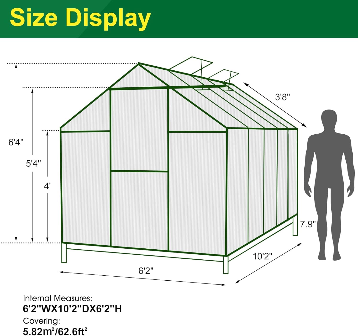 6'x10' Walk-in Greenhouse with 4mm 800G Polycarbonate Panels - Heavy-Duty Aluminum Frame, Wind/Snow Resistant for Gardening, Includes Sliding Door & Ventilation Windows (Green)