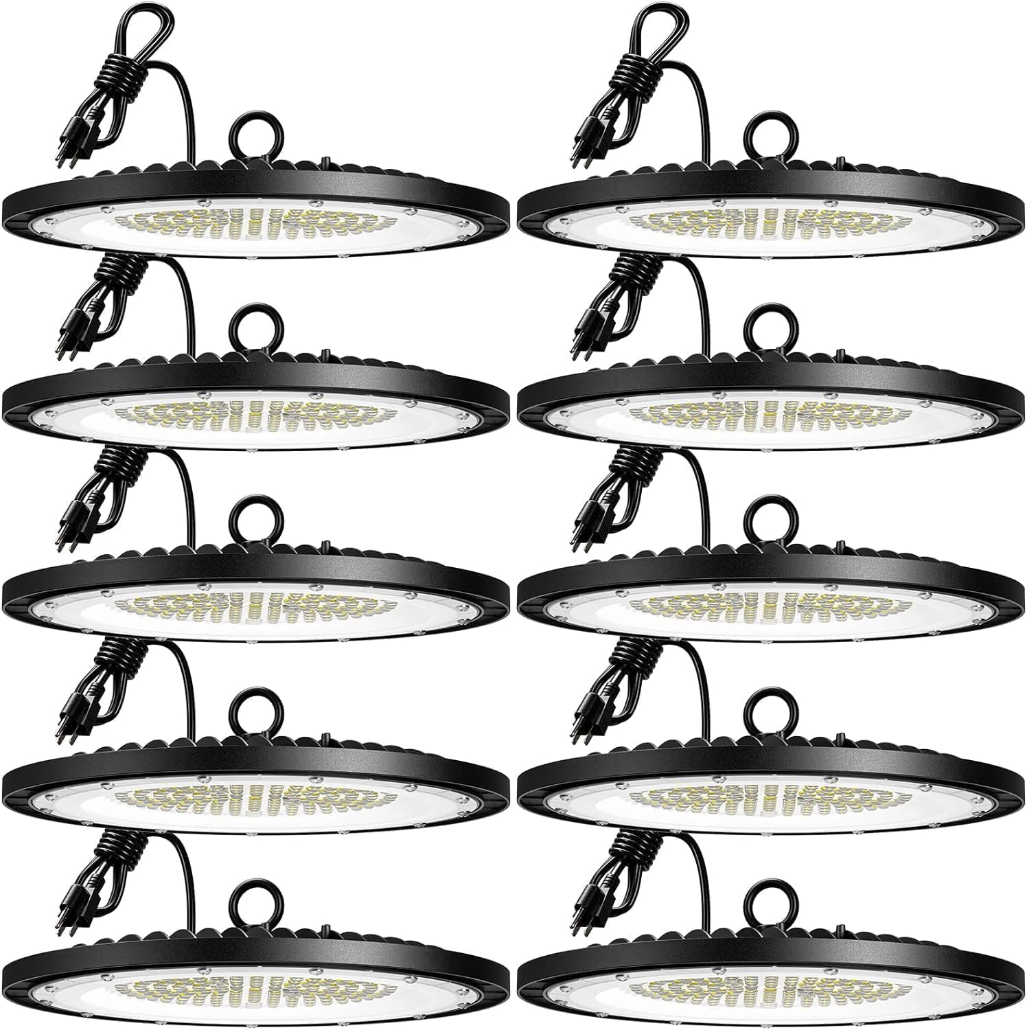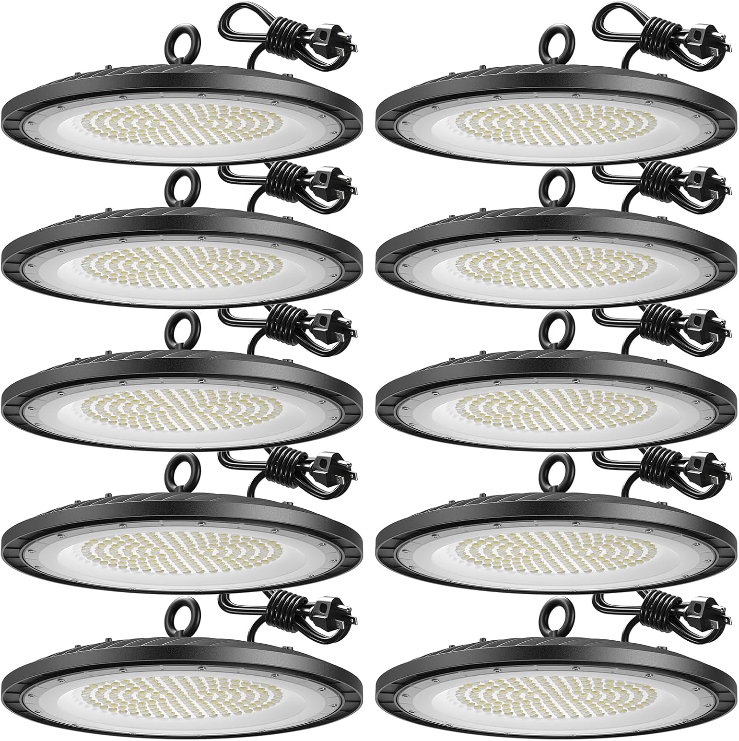 200-watt, 10 sets of UFO lamps, LED ceiling lights, 28,000 lumens, 5000K LED ceiling lights, 5-foot cable, can replace 650-watt metal halide/hot mercury lamps, suitable for gyms, factories, barns and warehouses.