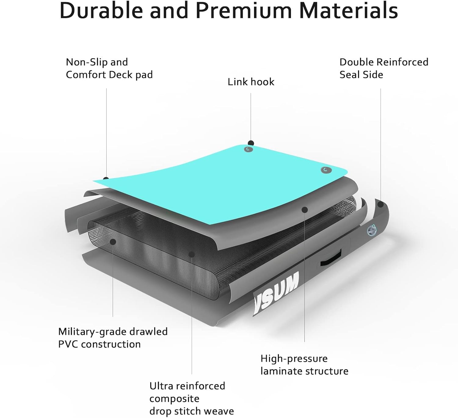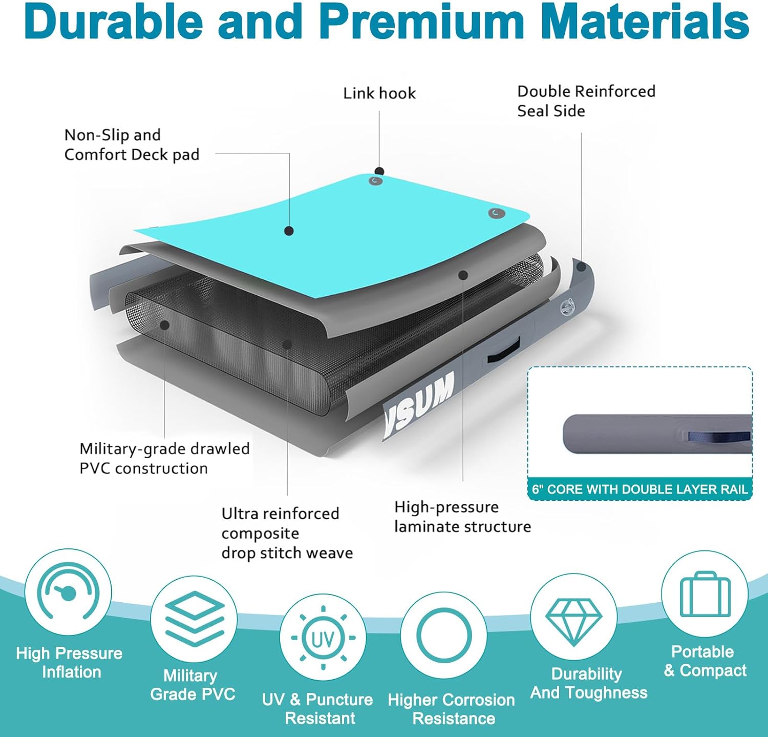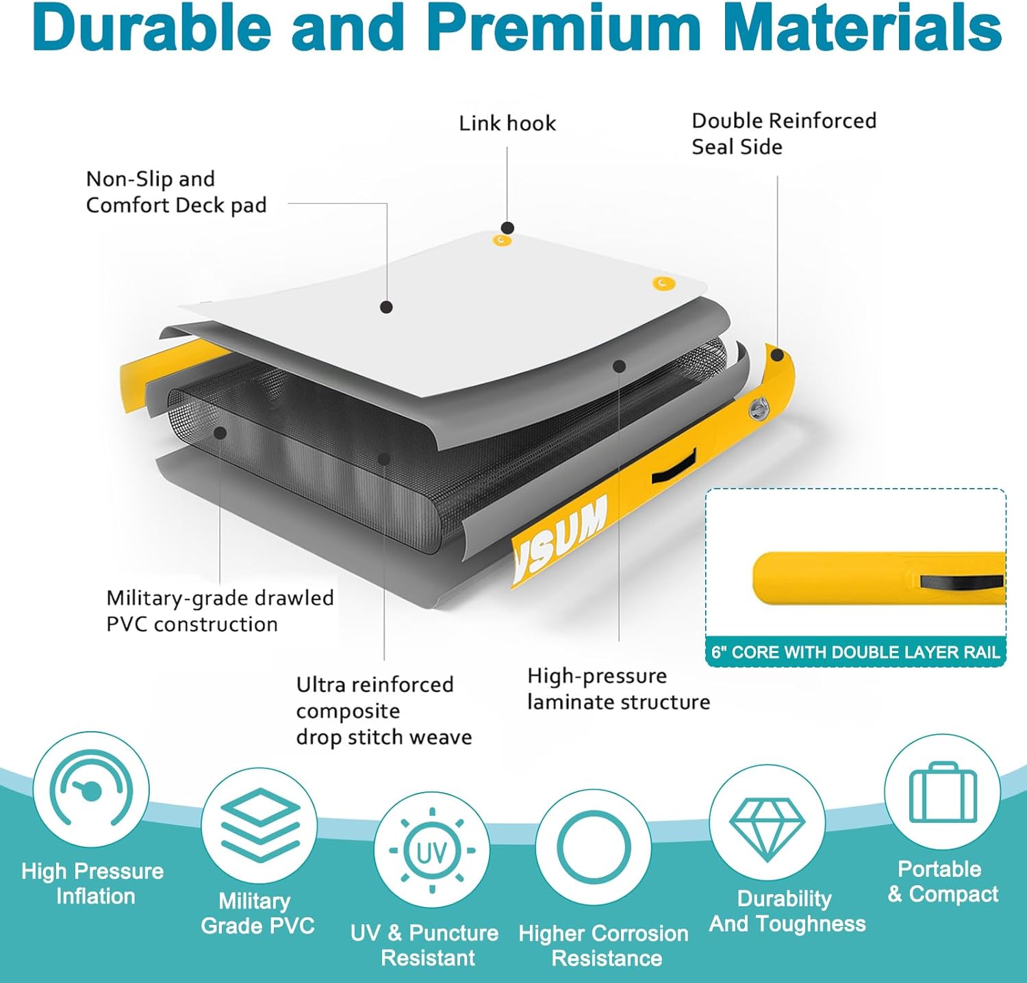 - Military-Grade Durability: Crafted with double-layer premium PVC and 6-inch thickened walls, this inflatable dock floating platform resists punctures, UV rays, and saltwater. Drop-stitch core ensures a non-slip, rigid surface for yoga, fishing, or lounging.