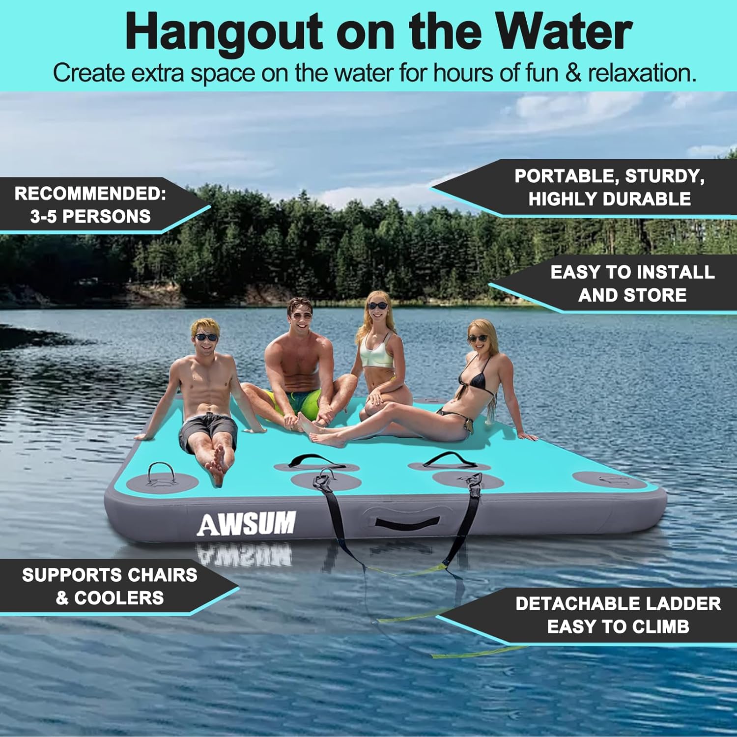 - Quick Setup & Portability: Enjoy effortless adventures with the AWSUM inflatable floating dock, Inflate/deflate in minutes with air pumps. Folds into a compact carry bag for vacation and travel to lakes, beaches, or pools.
