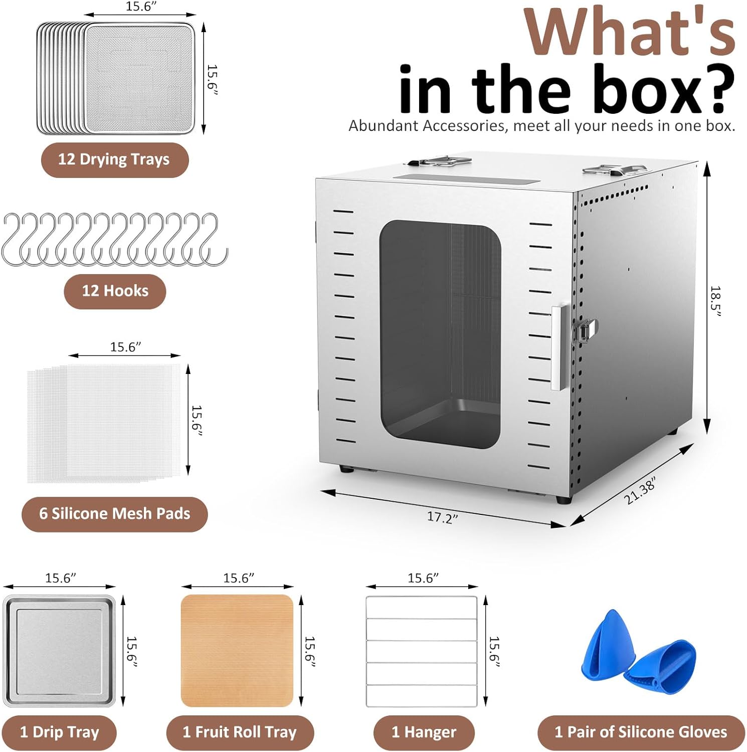 - [Commercial Design Large Capacity]:Commercial design is especially suitable for businesses or households with a large amount of food to be made.Includes large size 12 drying trays,each tray is 15.75* 15.75 inches. 1 drip tray, 6 silicone pads, 1 non-stick sheet, 1 hanger, 12 hooks, and a pair of silicone gloves for creating various recipes.Dehydrator Machine can dehydrate a variety of vegetables, fruits, meats, flowers and other foods, and easily lock the minerals and vitamins in the food.