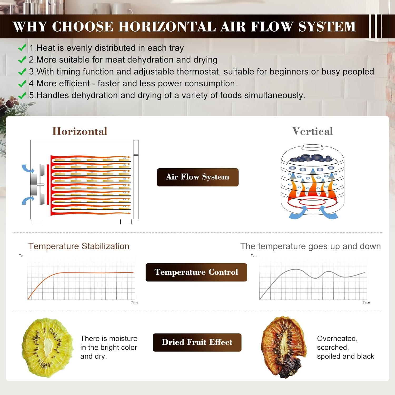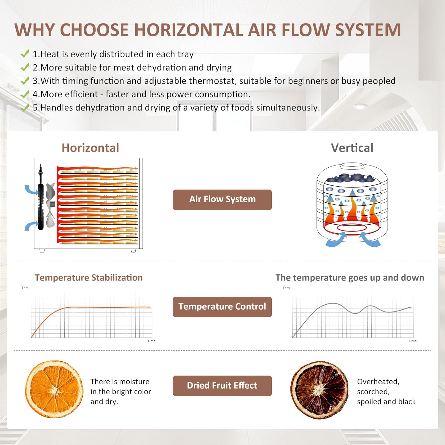 - [Noiseless锛�50dB]:Wait for food to dehydrate after setting time and temperature. The integrated horizontal airflow system drying evenly heats all the trays to ensure more even drying and noiseless operation.