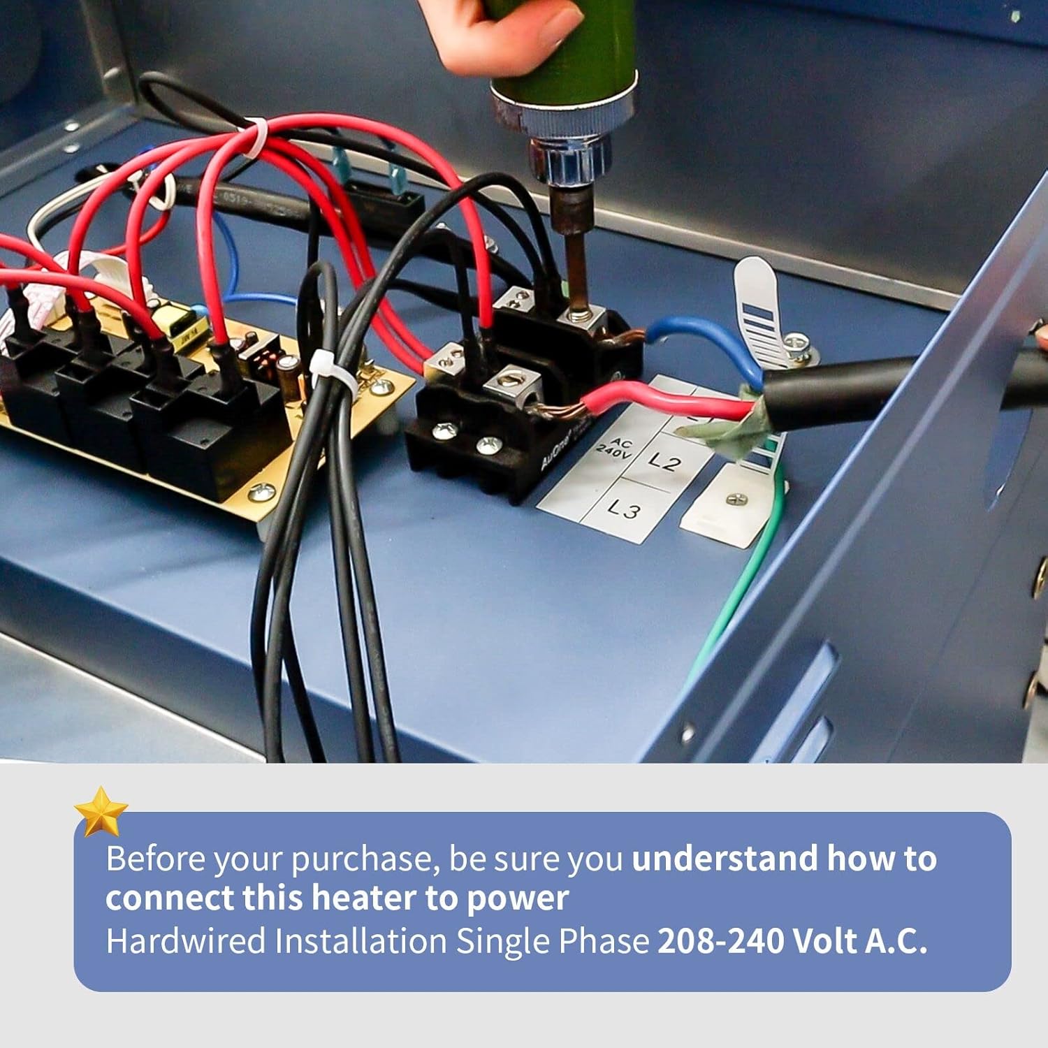- Hardwired Installation: You will need an electrician to do this safely. The garage heater must be grounded and hardwired to a properly sized current protection circuit breaker in accordance with the (US) National Electric Code and local codes