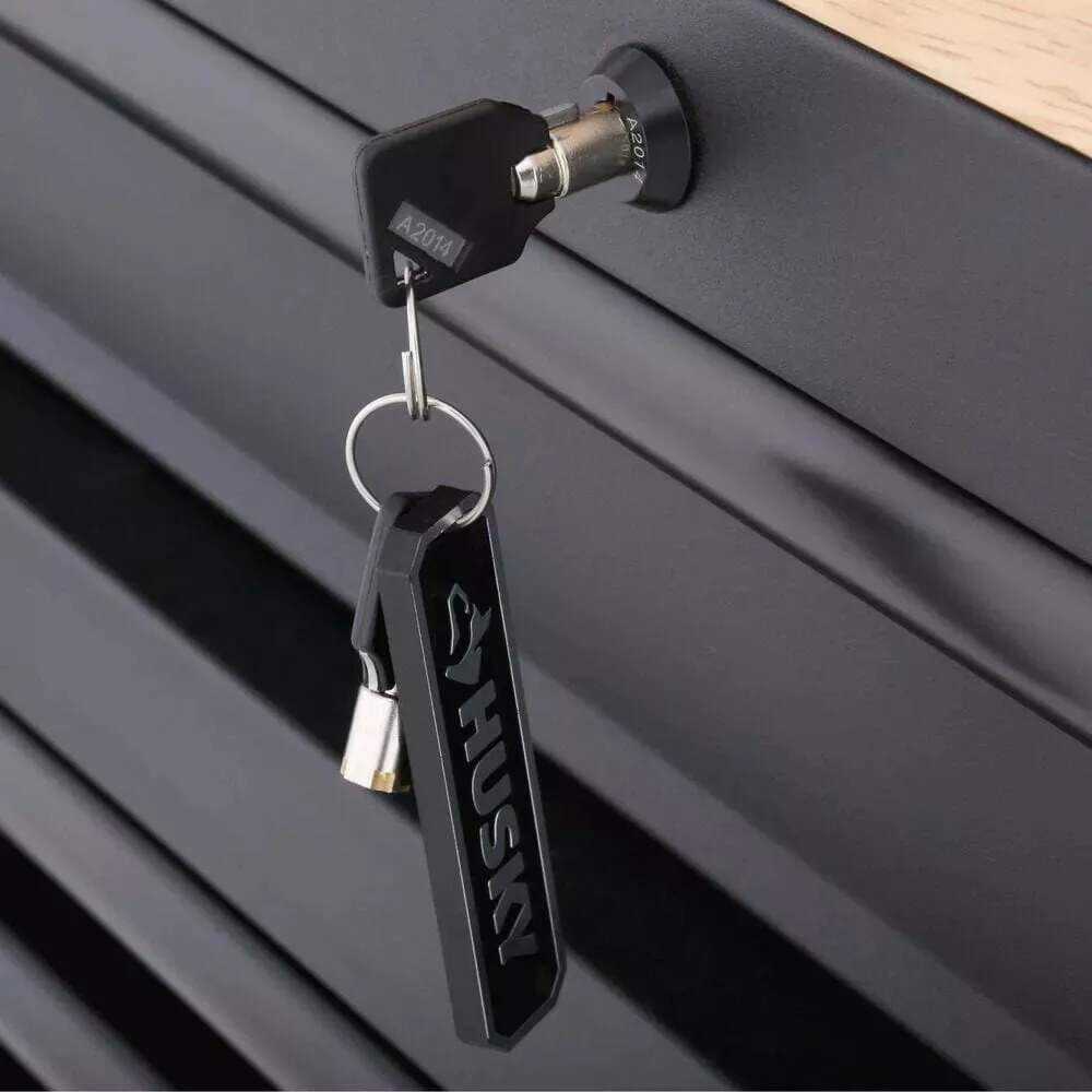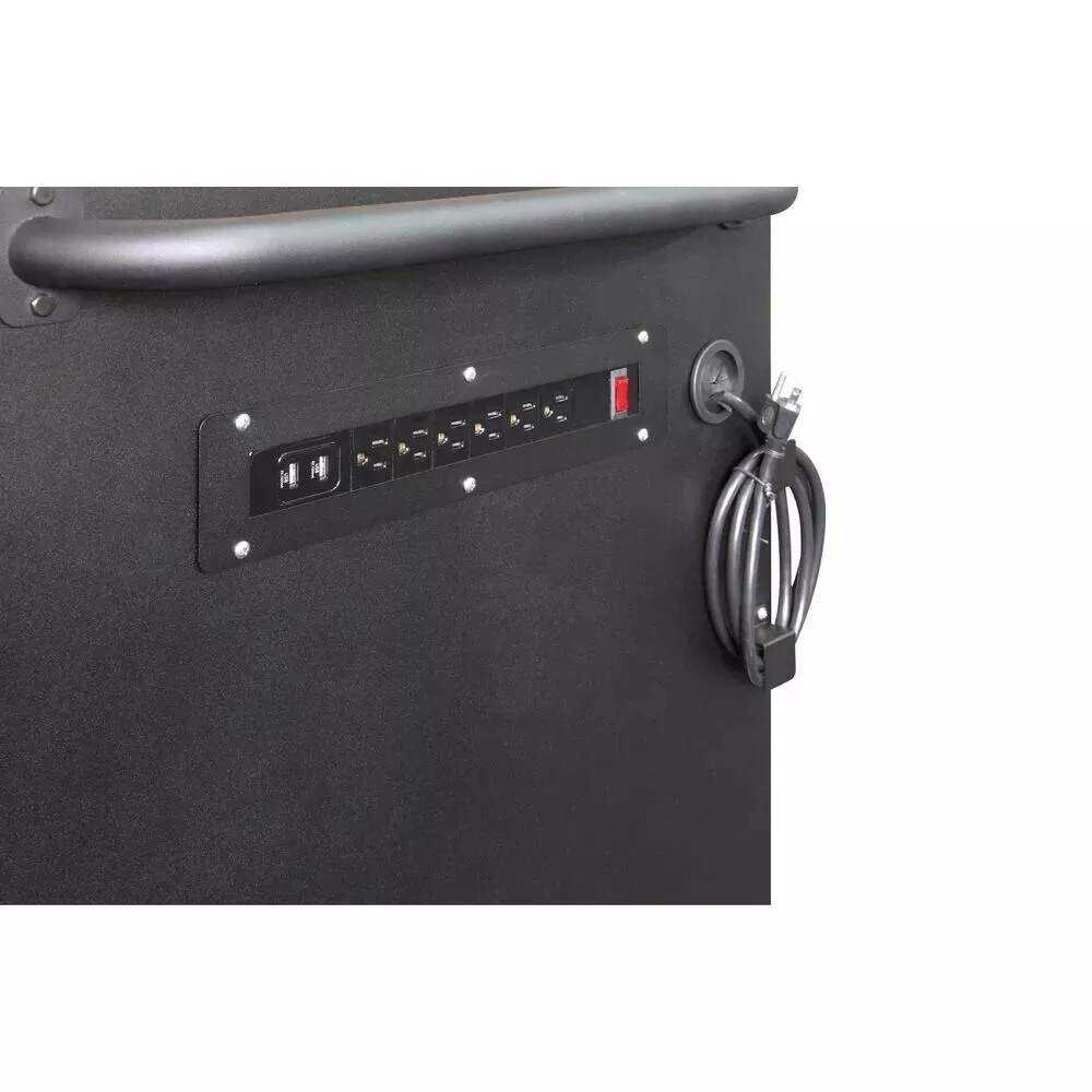 The Husky Heavy Duty Workbench is massive with 26,551 cu. in. of storage space and 2500 lb. load capacity. Built to take on any project, the upgraded features were thoughtfully designed. This rolling tool cabinet has heavier 19-Gauge steel. This workbench is 24 in. deep, which is 6 in. deeper than most standard rolling tool cabinets. The built-in, adjustable-height, 22 in. H steel pegboard back wall can be raised or lowered into (2) different positions and holds up to 200 lbs. It also features a 48 in. shelf that attaches to the pegboard and can hold up to 40 lbs. The 1.2 in. thick, solid wood top is coated with polyurethane for added utility and durability. Charge your power tools with the built-in, 6-outlet, 2 USB power center. The 120 lb. rated, soft-close drawer slides keep the drawers from accidentally opening or from slamming shut. The full-length drawer provides convenient storage for longer items. The 2 deep bottom drawers have double 120 lb. drawer glides. The 1-door storage locker has a storage area that is 13.64 in. W x 20.4 in. H and includes an adjustable-height shelf that can handle a 100 lb. load. There is a side shelf for bottle and can storage inside the door. For added security, both the chest and cabinet are fitted with a barrel key and lock system. The 5 in. x 2 in. industrial grade casters with easy locking pedals help the unit roll smoothly.