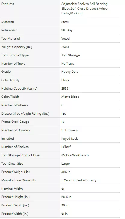 When you buy a Heavy-Duty 61 in. W 10-Drawer 1-Door, Deep Tool Chest Mobile Workbench in Matte Black w/ Hardwood Top, Pegboard & Shelf online from Our Store, we make it as easy as possible for you to find out when your product will be delivered.If you have any questions about your purchase or any other product for sale, our customer service representatives are available to help.Whether you just want to buy a or shop for your entire home, Our Store has a zillion things home.