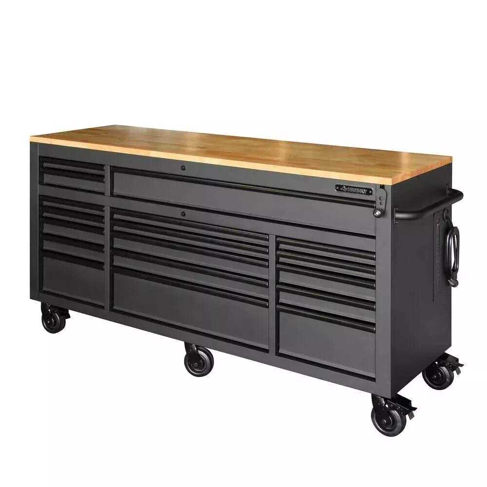 Husky 72 in. 18-Drawer Mobile Workbench with Adjustable-Height Solid Wood Top, Matte Black