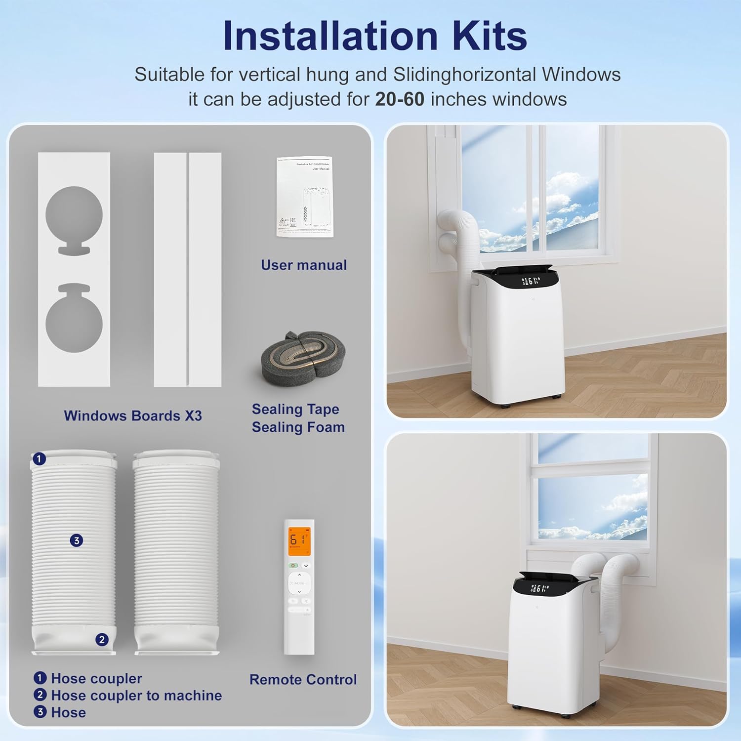 - ���Easy to Move & Install�� This floor free stand up air conditoning machine comes with 4pcs heavy-duty wheels and hidden handles on both sides so you can easily move the machine to any room. Windows sealing kit and exhaust hose need to be installed, all are included in the package, and fit most Sliding vertical window and horizontal windows. Easy 3 steps to install: First attach sealing foam to the windows, Step 2, adjust the length of window panels and install, Step 3 insert adapters of the exhaust hose to the ac units and windows board, finished and start.