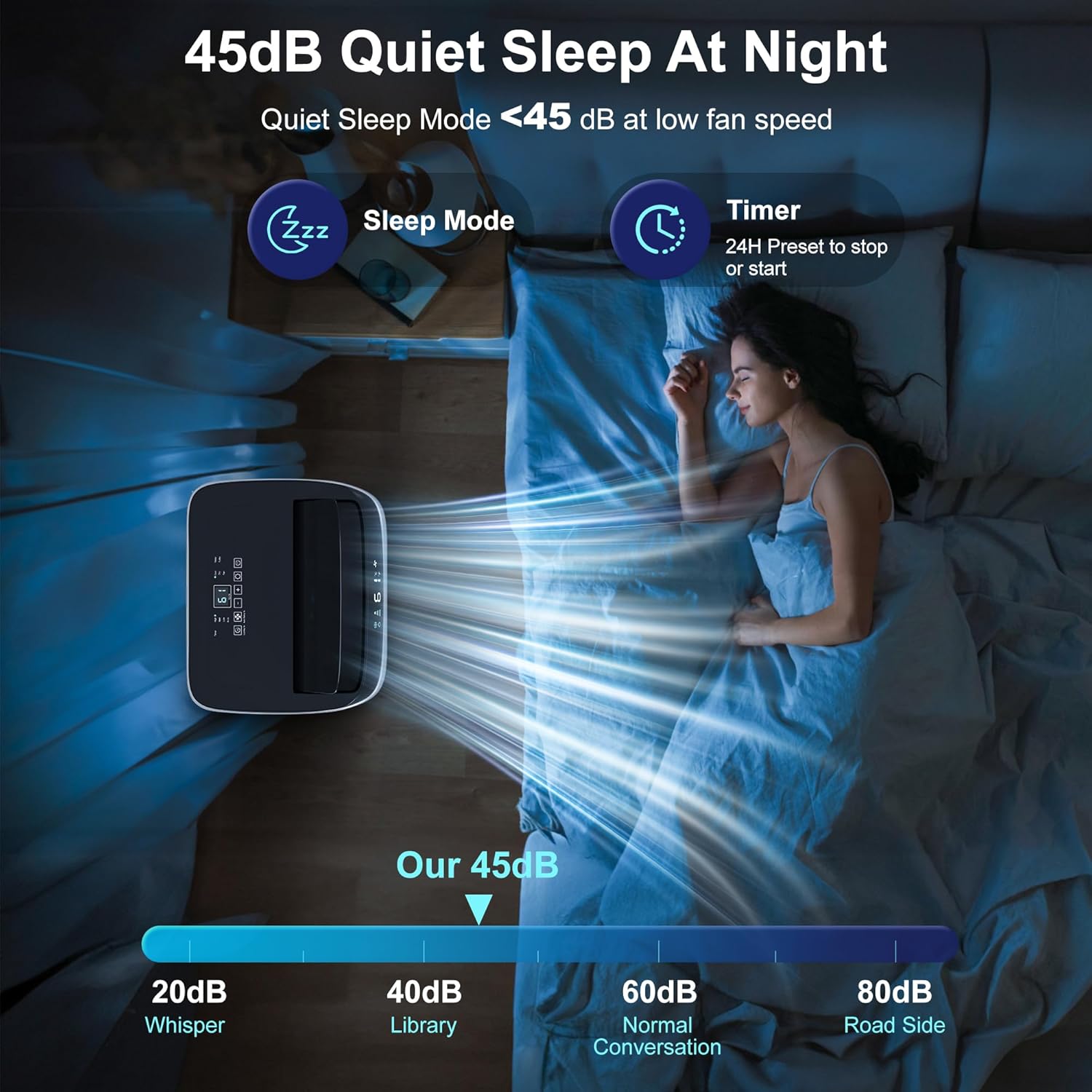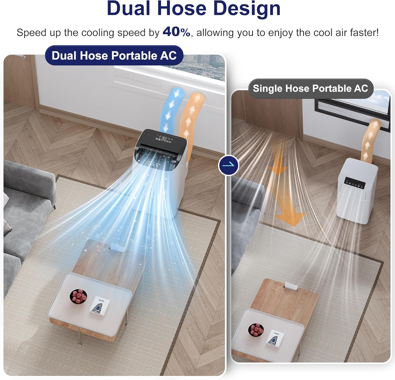 - ��Dual Hose Design & 45dB Quiet Sleep Mode�� Our dual hoses design enables the inverter ac unit to intake and exhaust air outdoors faster, forms balanced air circulation indoors and prevents hot outside air from seeping in through gaps锛�Cool down your room 30-40% faster. Sleep Mode will maintain an optimal temperature in low fan speed, and provide you less than 45dB quiet bedroom. You can also preset to stop the ac unit after 0.5-24 hours, all these function are designed to give you a cool, quiet and comfortable sleep in the hot summer.
