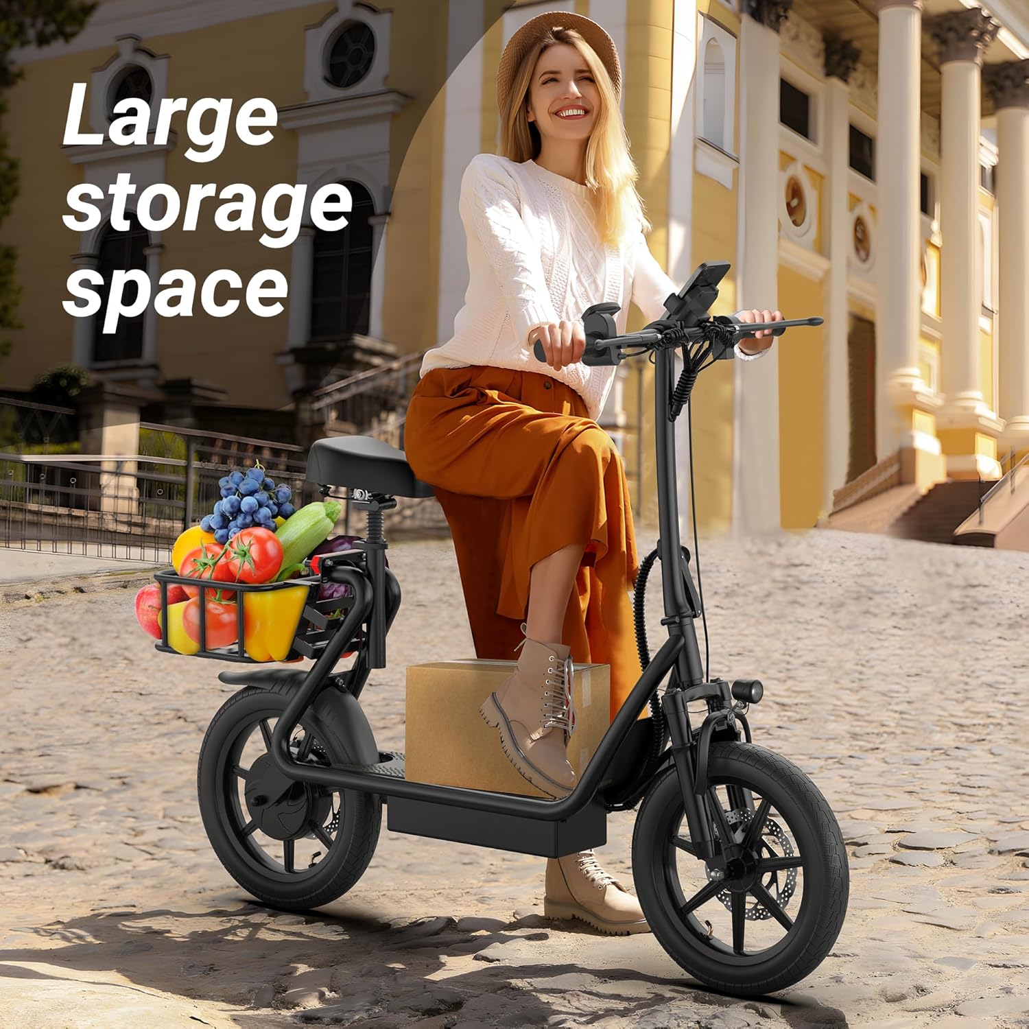- ���Enhanced Safety Features: e scooter with front and rear disc brakes, as well as dual shock absorbers, this scooter ensures a safe and stable riding experience. electric scooter with seat with 14-inch pneumatic tires offer excellent traction and control.