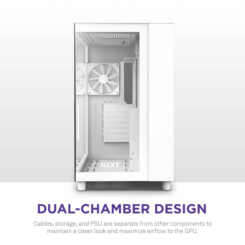 - DUAL-CHAMBER DESIGN: Cables, storage, and PSU are separate from other components to maintain a clean look and maximize airflow to the GPU.