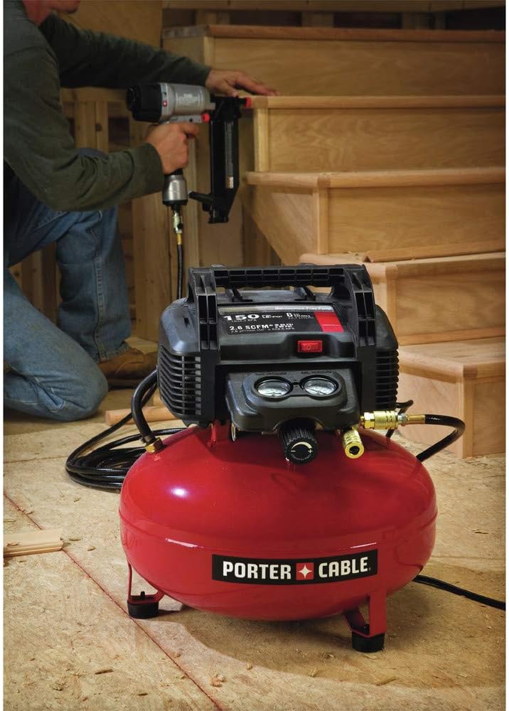 - 6 gal Pancake style tank of the PORTER-CABLE air compressor is made for stability, includes water drain valve and rubber feet