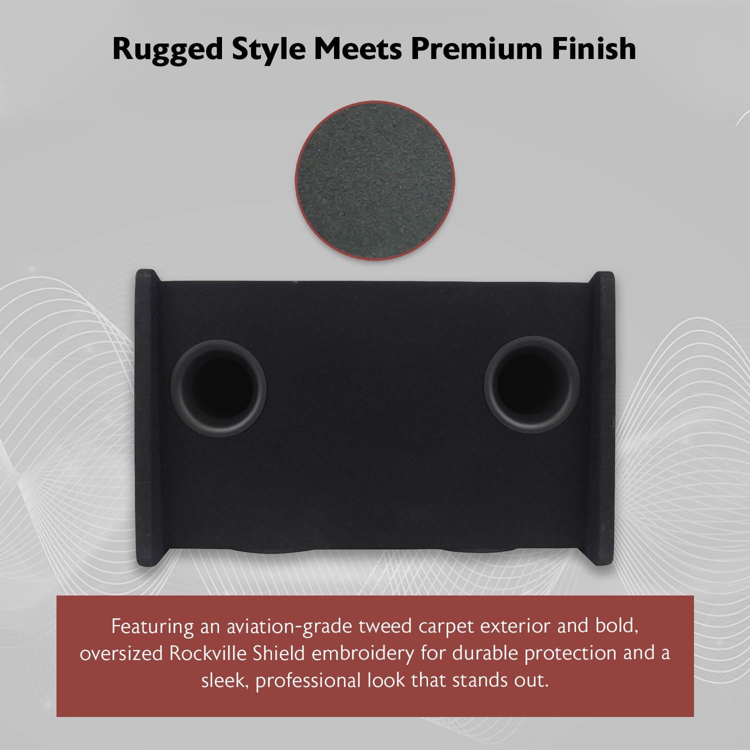 - Angled at 15% for near perfect in vehicle bass alignment. Exterior: high quality aviation grade tweed Carpet. Oversize Rockville Shield embroidery. Mono, Gold-plated push style, speaker terminal. Dual, high-power, high-efficiency 12" Subwoofers.