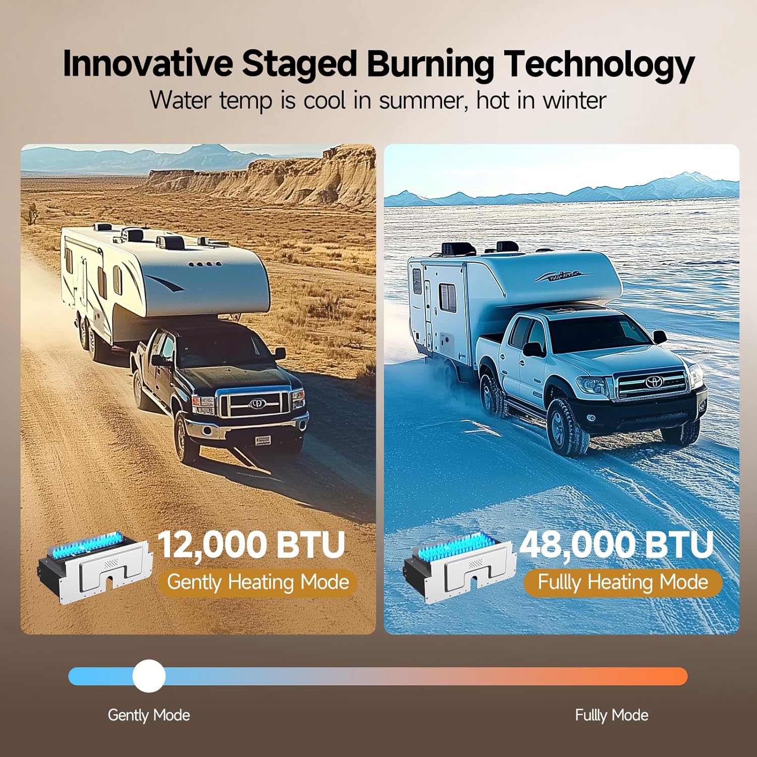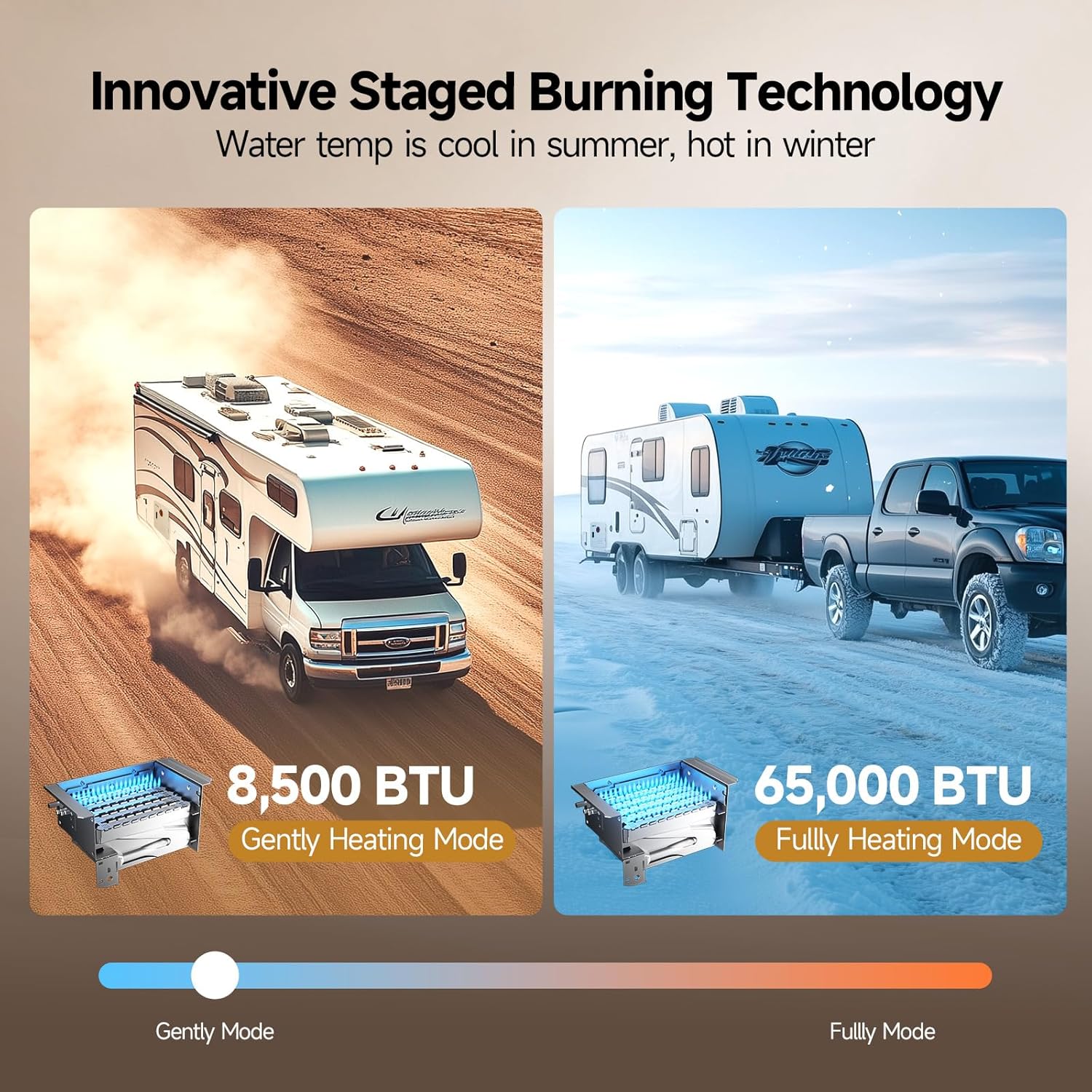 - High altitude Application �� The KINGRVER RV on-demand Water Heater can operate at above 5000 ft high altitudes. It accommodates the low-oxygen conditions experienced at such elevations. Staged combustion technology modulates the flame intelligently based on seasonal factors, keeping water temperatures steady while reserving limited propane for travelers navigating the region's elevated terrain by caravan. The combined effects deliver an unprecedented high-altitude travel experience.