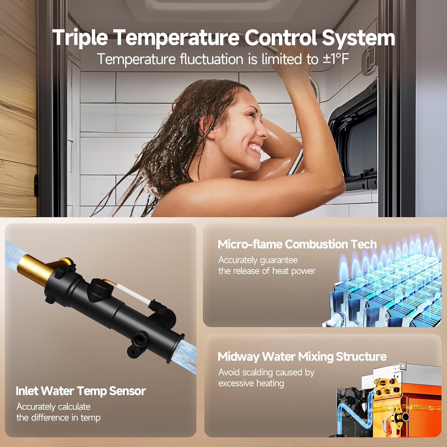 - Endless Hot Water Supply �� The heat output is enough to supply an entire RV with endless hot water, like other higher BTU models, and also save propane. The KINGRVER tankless RV water heater effortlessly supports multiple hot showers and dishwashing without preheating. The Adjustable Temperature ranges from 95掳F-123掳F.