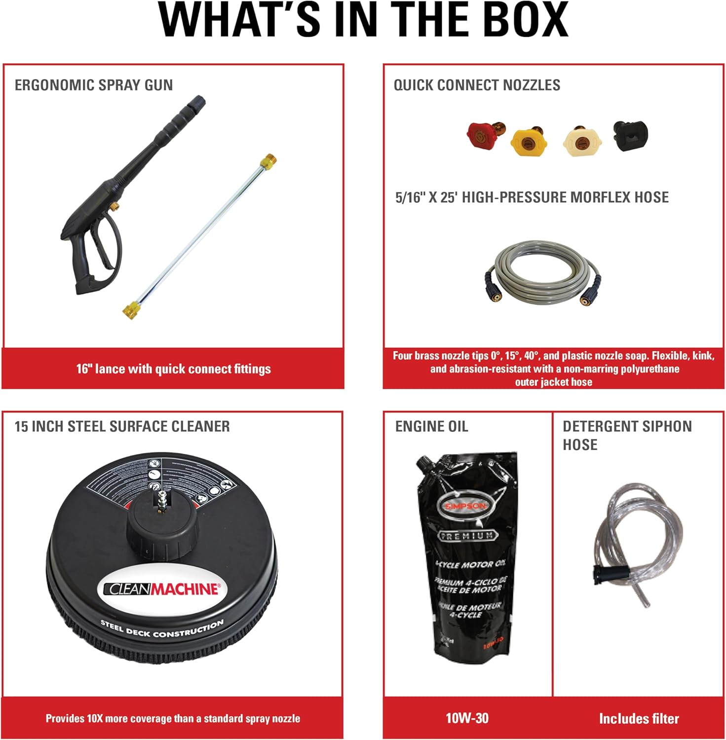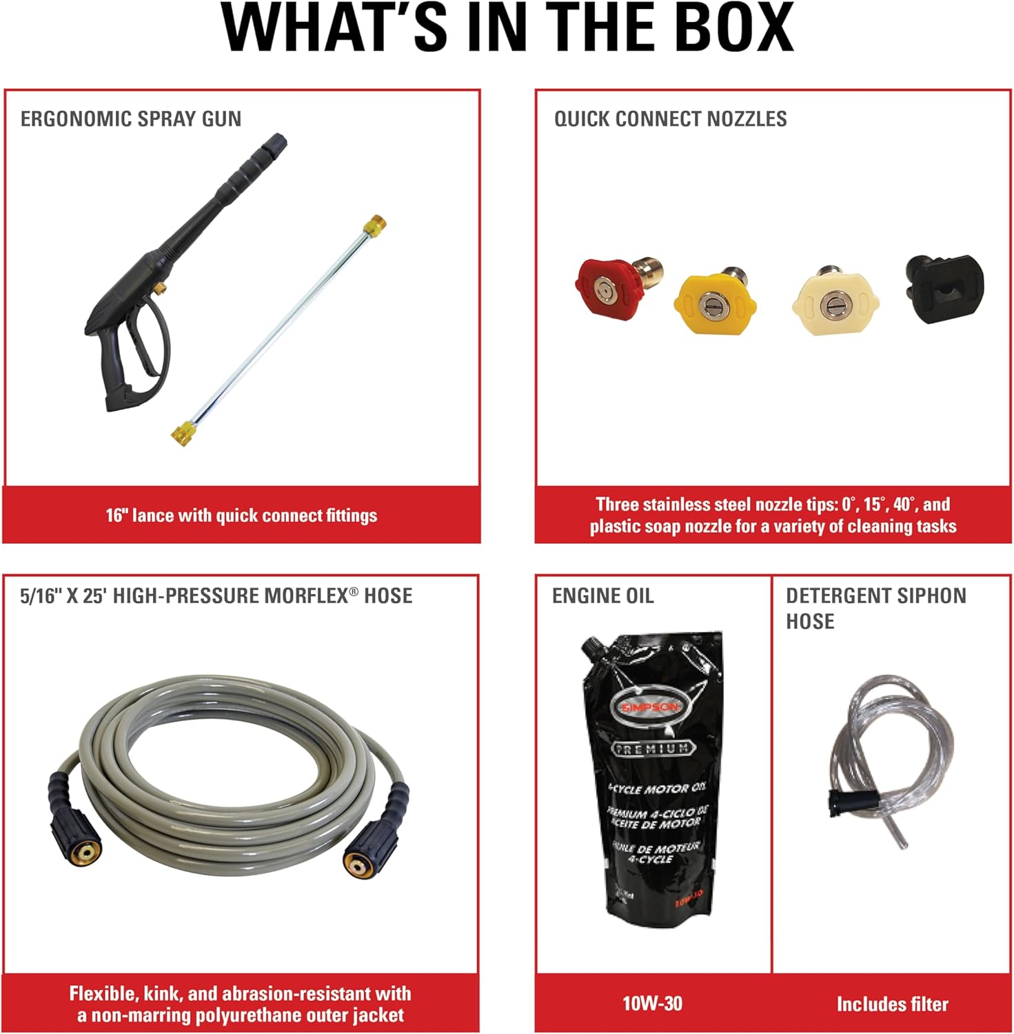 - Includes Quality Accessories: 5/16" x 25' MorFlex high-pressure hose is non-marring, flexible, abrasion-resistant; 4 Quick connect nozzle tips: 0掳, 15掳, 40掳, Soap nozzle to use for a variety of cleaning applications; 16" steel wand/lance; Ergonomic spray gun