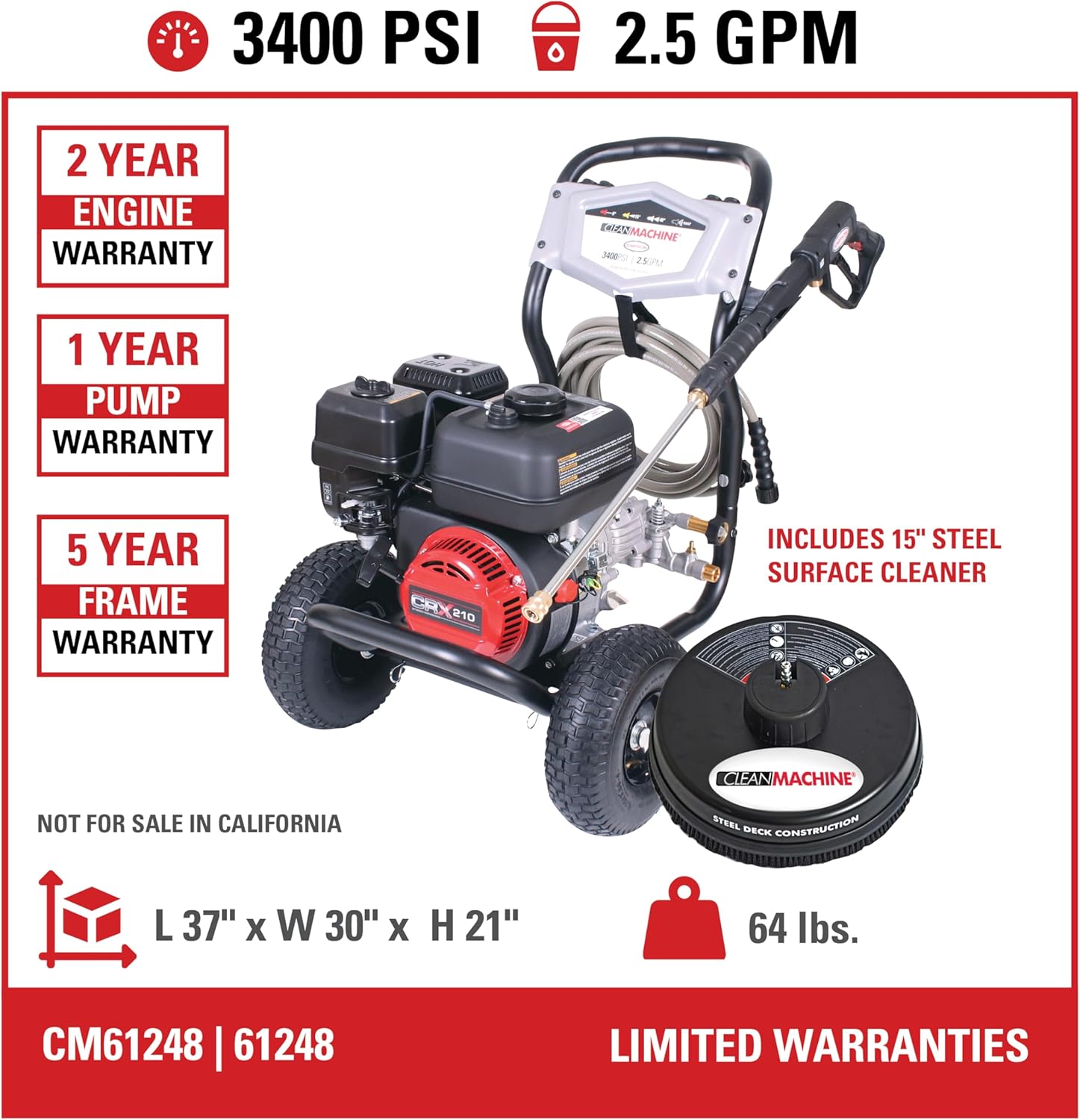 Cleaning CM61083 Clean Machine 3400 PSI Gas Pressure Washer, 2.5 GPM, CRX Engine, Includes Spray Gun and Wand, 4 QC Nozzle Tips, 5/16-in. x 25-ft. MorFlex Hose.