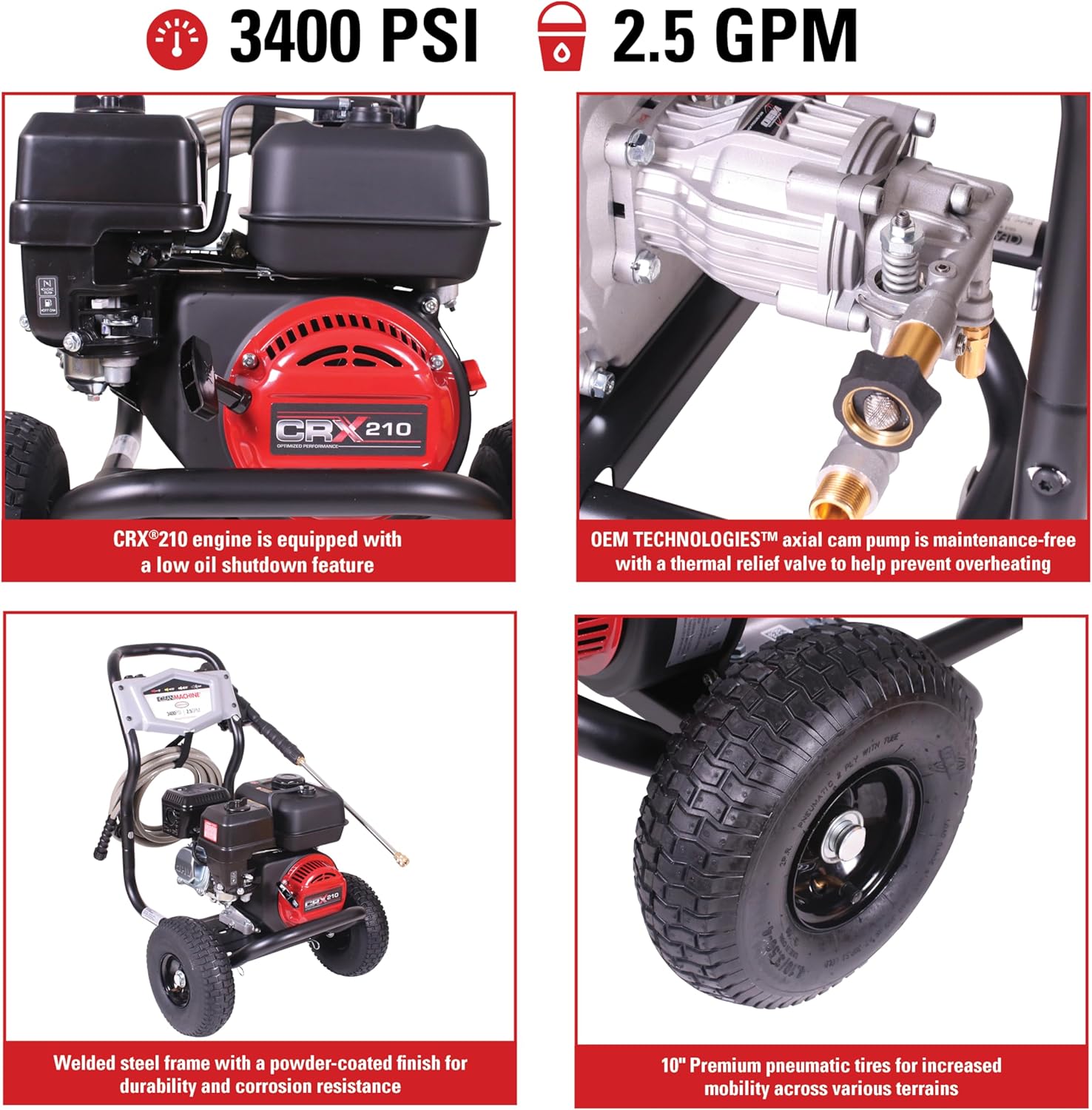 - Power and Durability: A powerful, reliable, maintenance-free OEM Technologies axial cam pump delivers 3400 PSI at 2.5 GPM and includes thermal relief to prevent overheating