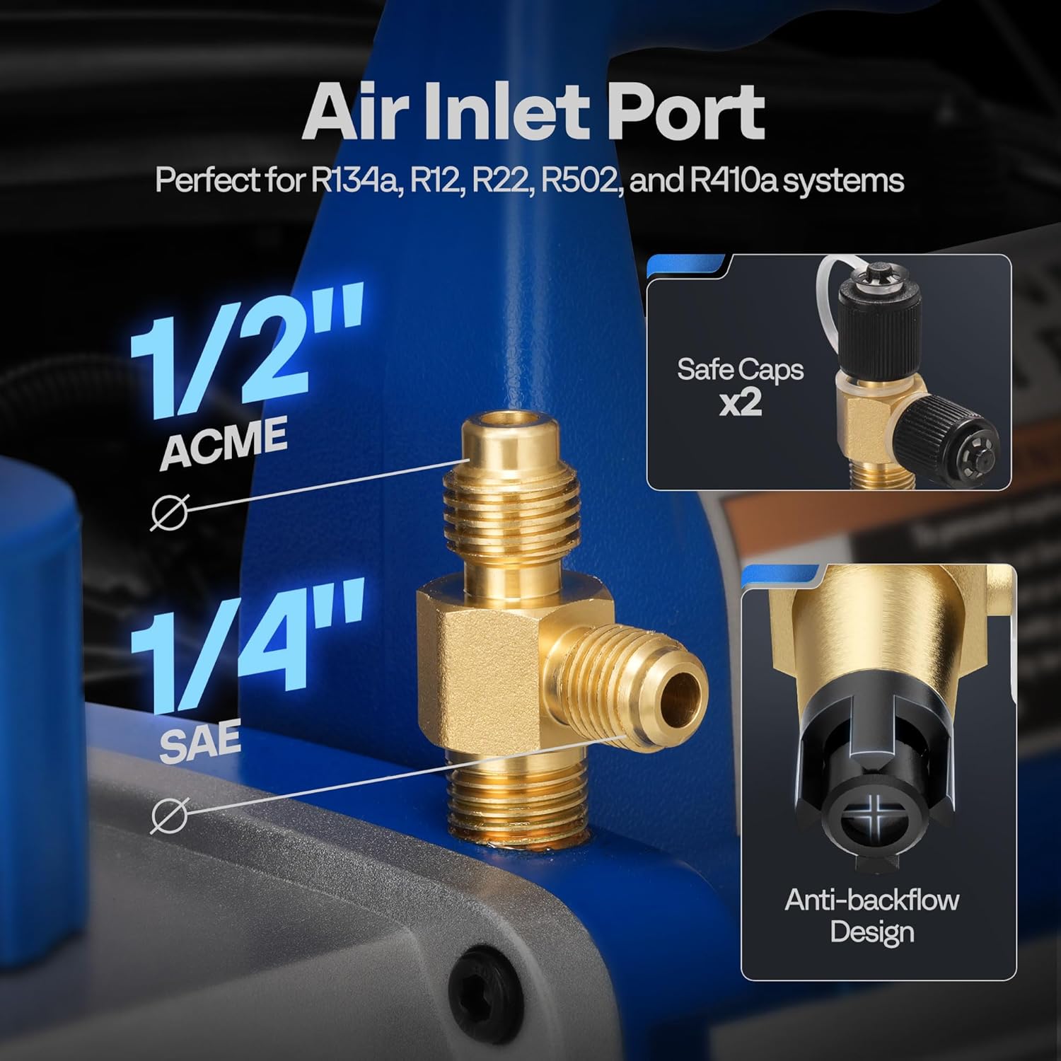 - �ALL NECESSARY ACCESSORIES: Includes a single-stage vacuum pump, a bottle of oil, a thermometer, and a gauge set; Perfect for automotive air conditioning, HVAC work, refrigeration, and other applications requiring a high vacuum pull from a compact pump