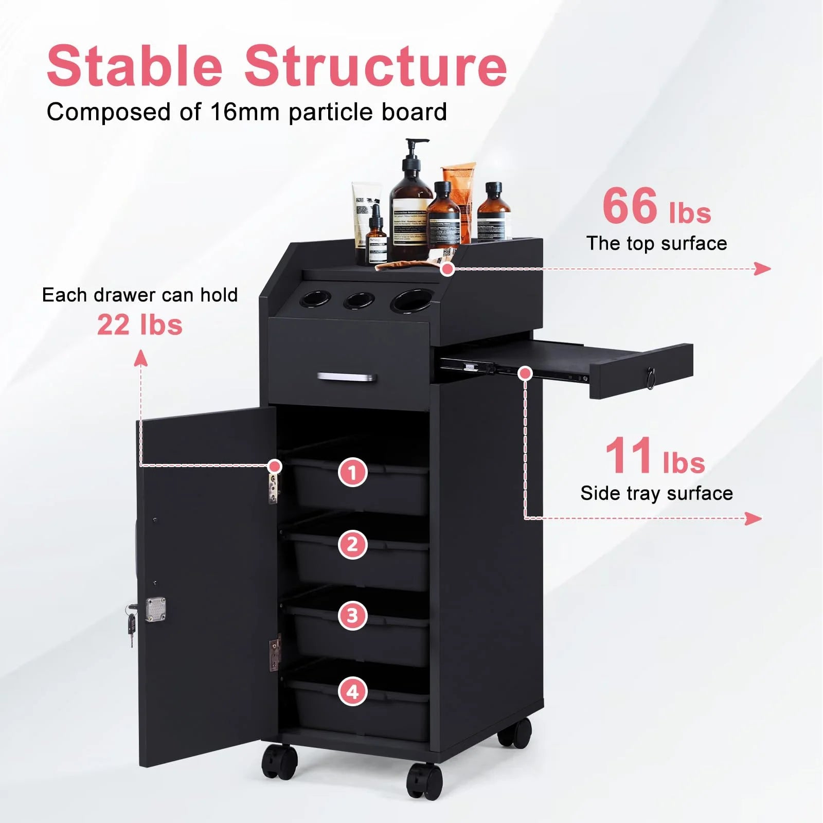 - ��4 Large Capacity Drawers��This salon trolley has 4 drawers, and these tray style drawers will give you plenty of room for a variety of grooming tools and supplies. The drawer is made of custom ABS material, which is more durable and not easy to damage.